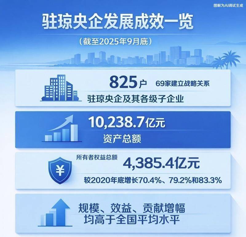 数据显示,截至2025年9月底,驻琼央企及其各级子企业共计825户,资产总额达10,238.7亿元,所有者权益总额为4,385.4亿元,分别较2020年底增长70.4%、79.2%和83.3%。2025年1—9月,央企在海南规模、效益、贡献增幅均高于全国平均水平。